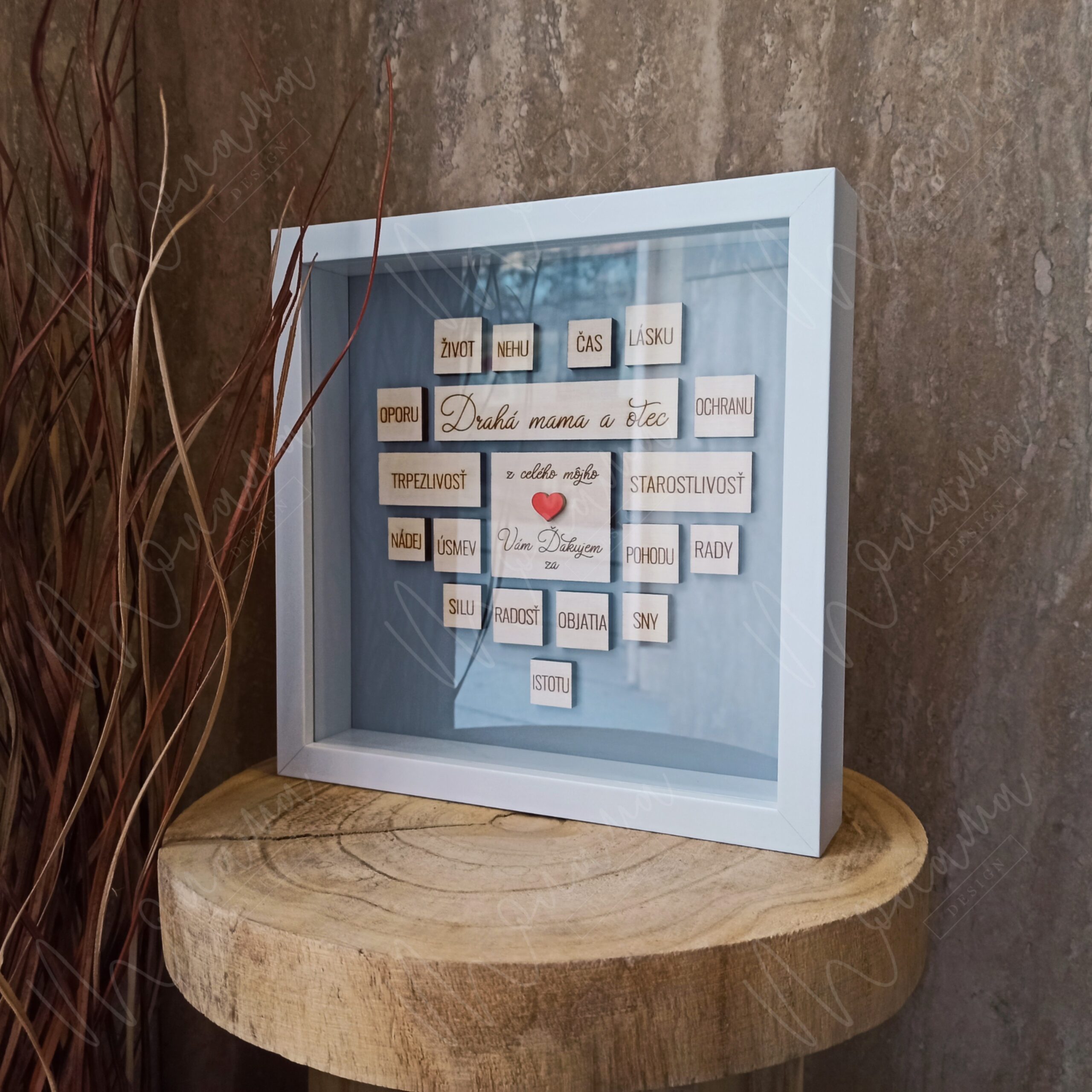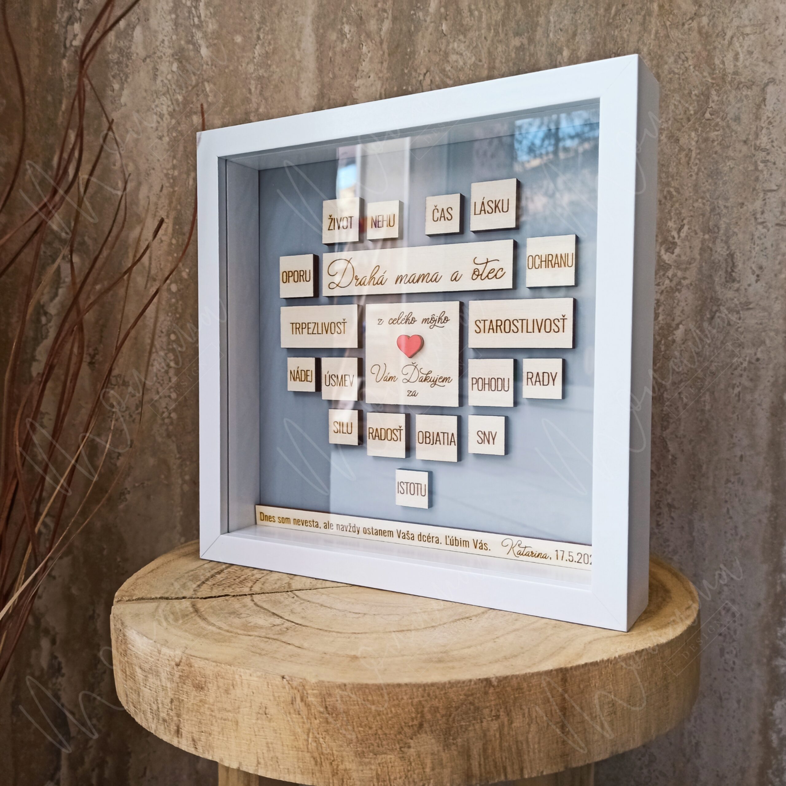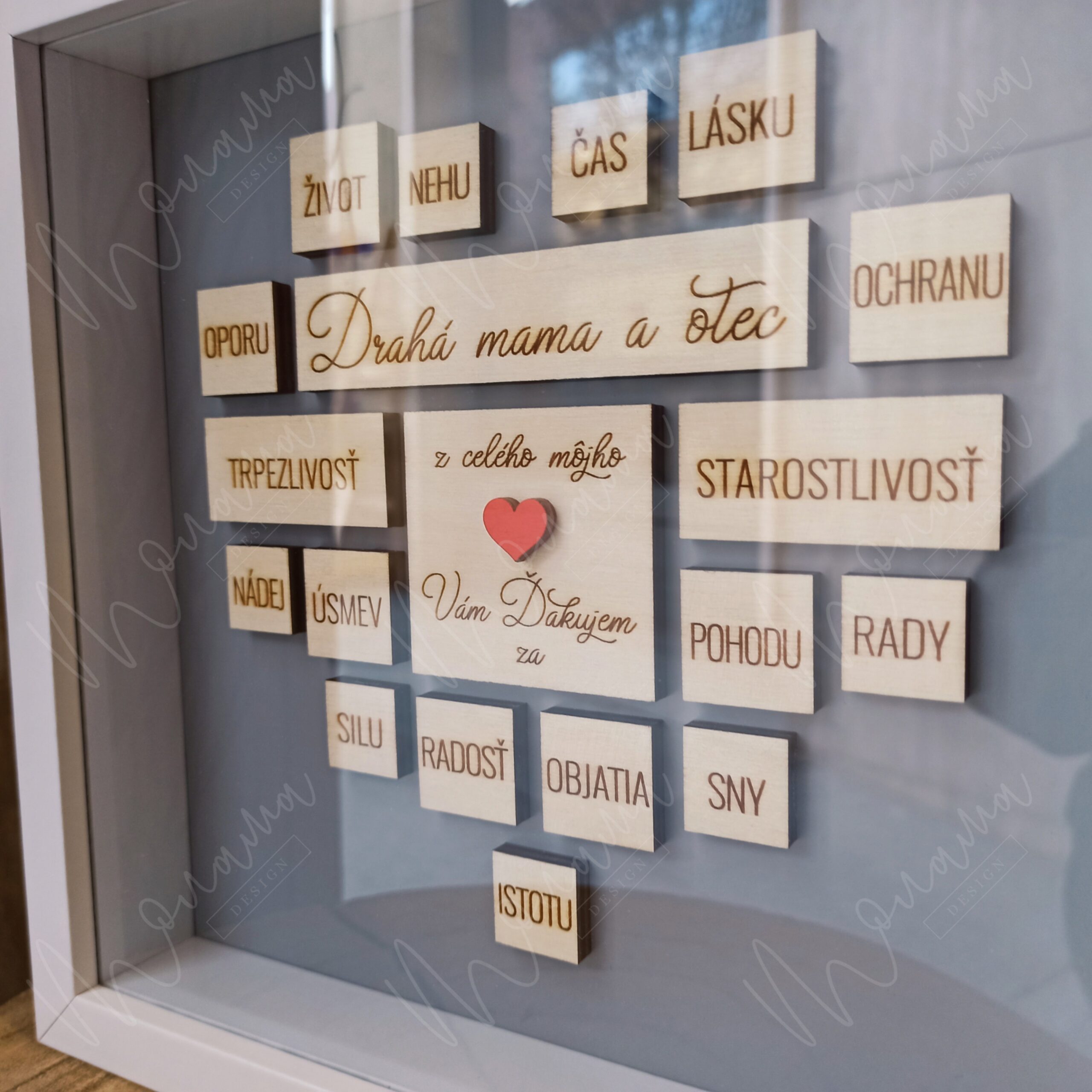 Rozmer Poďakovania rodičom v rámiku je 21,5 cm x 21,5 cm, hĺbka 5 cm.