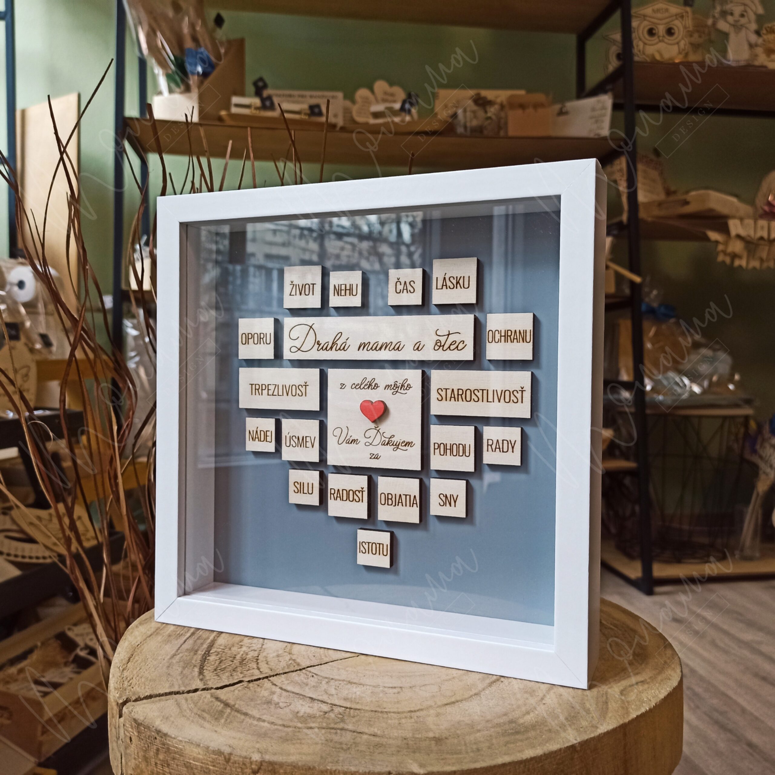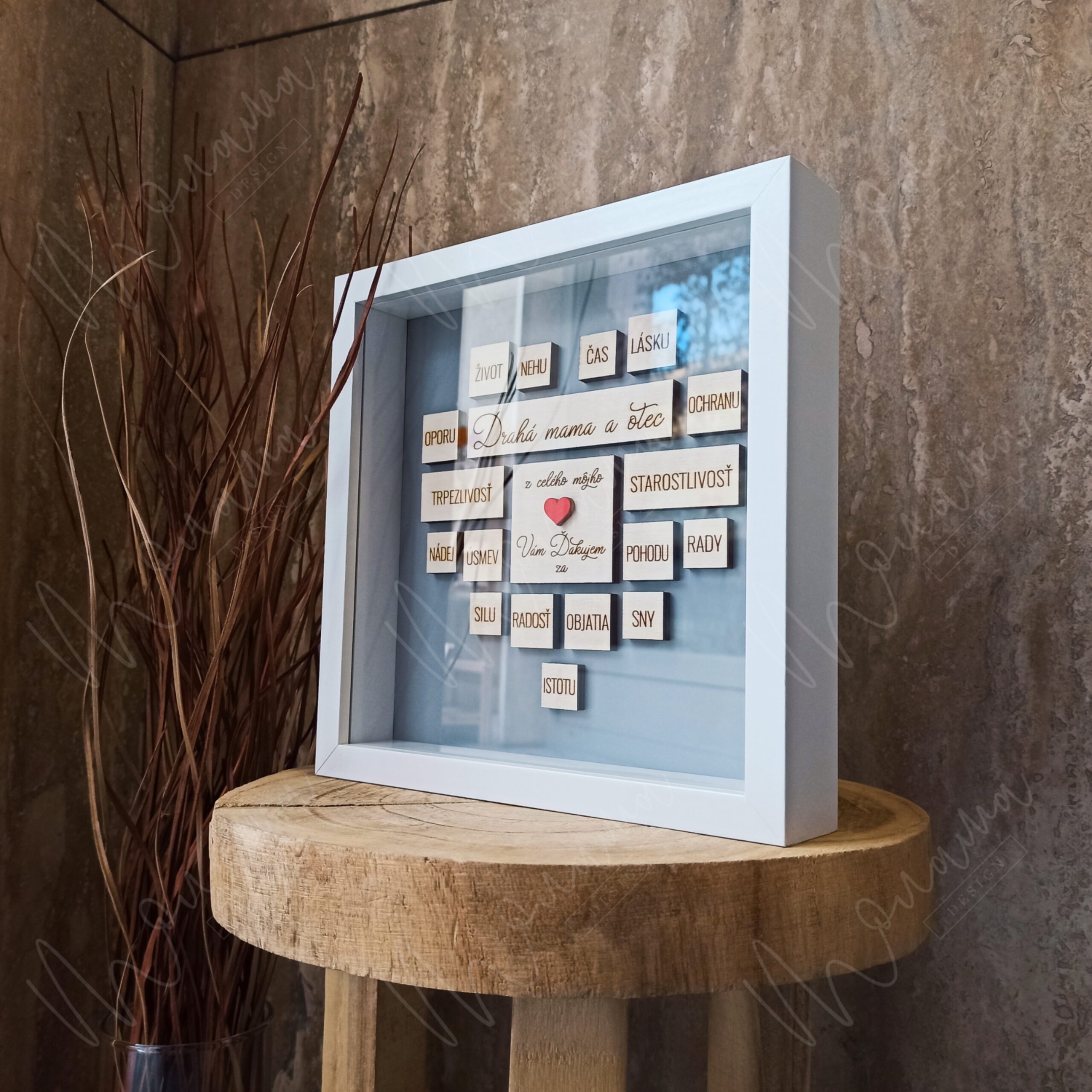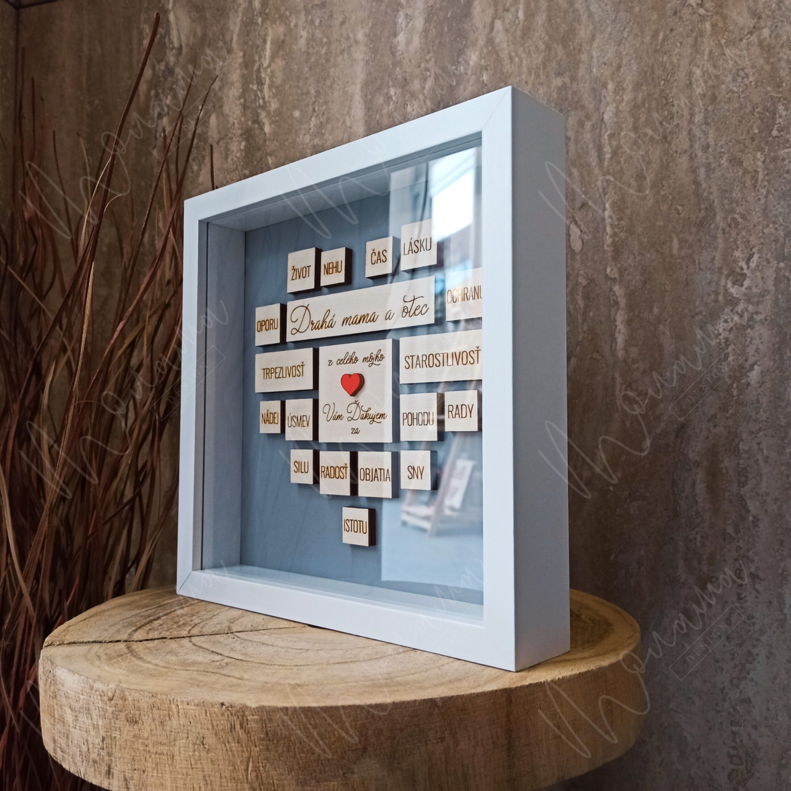 Rozmer Poďakovania rodičom v rámiku je 21,5 cm x 21,5 cm, hĺbka 5 cm.