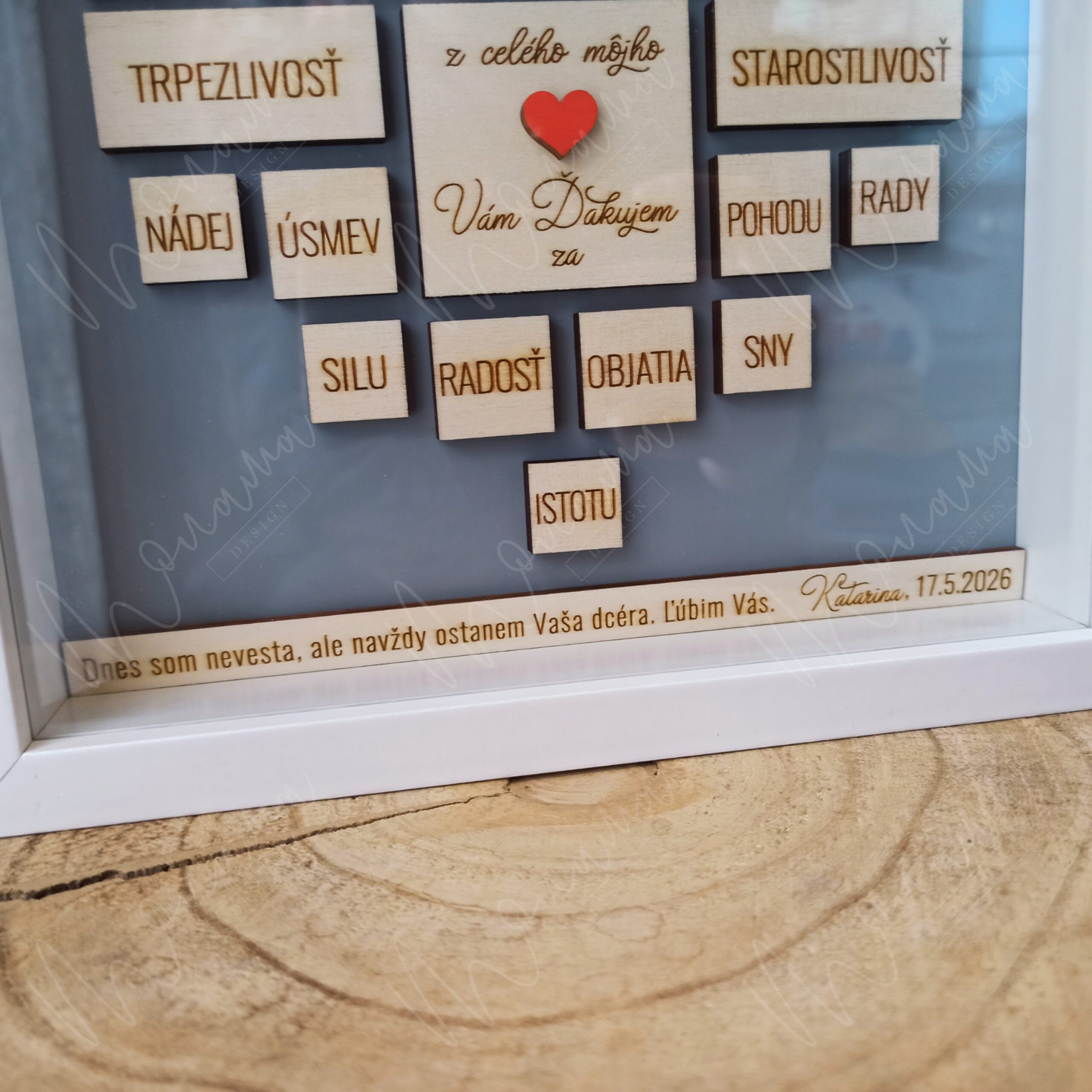 Poďakovanie rodičom v rámiku, vnútorné srdce je vyrezávané zo 6 mm hrubej preglejky. Rámik na predné sklo.